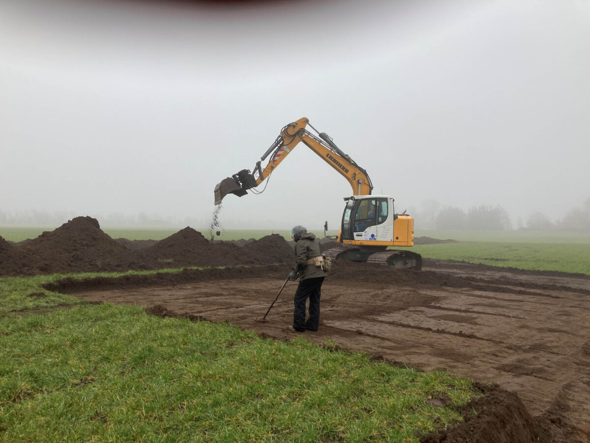 挖掘機和研究人員在丹麥布拉坦德的田野裡挖掘和尋找維京時代的文物。(來自丹麥Nordjyske Museer)