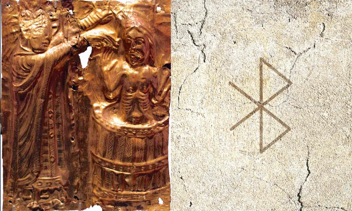 (左)神職人員波帕(Poppa)和哈拉爾德(Harald)洗禮的故事被描繪在丹麥坦德魯普教堂(the Church of Tamdrup)的鍍金祭壇上(Anagoria/CC BY 3.0);(右)藍牙徽標結合了國王的首字母:H(ᚼ)和B(ᛒ)。(Alex_Murphy,Shutterstock)