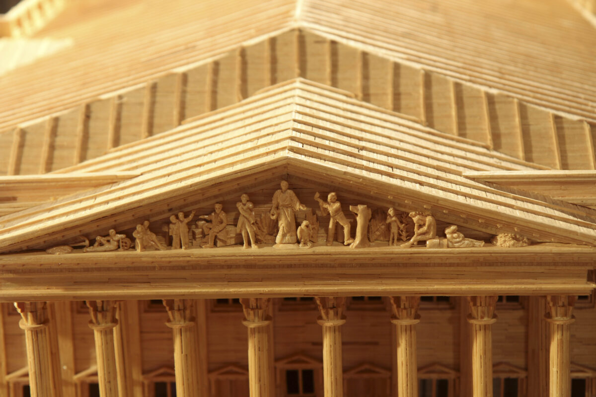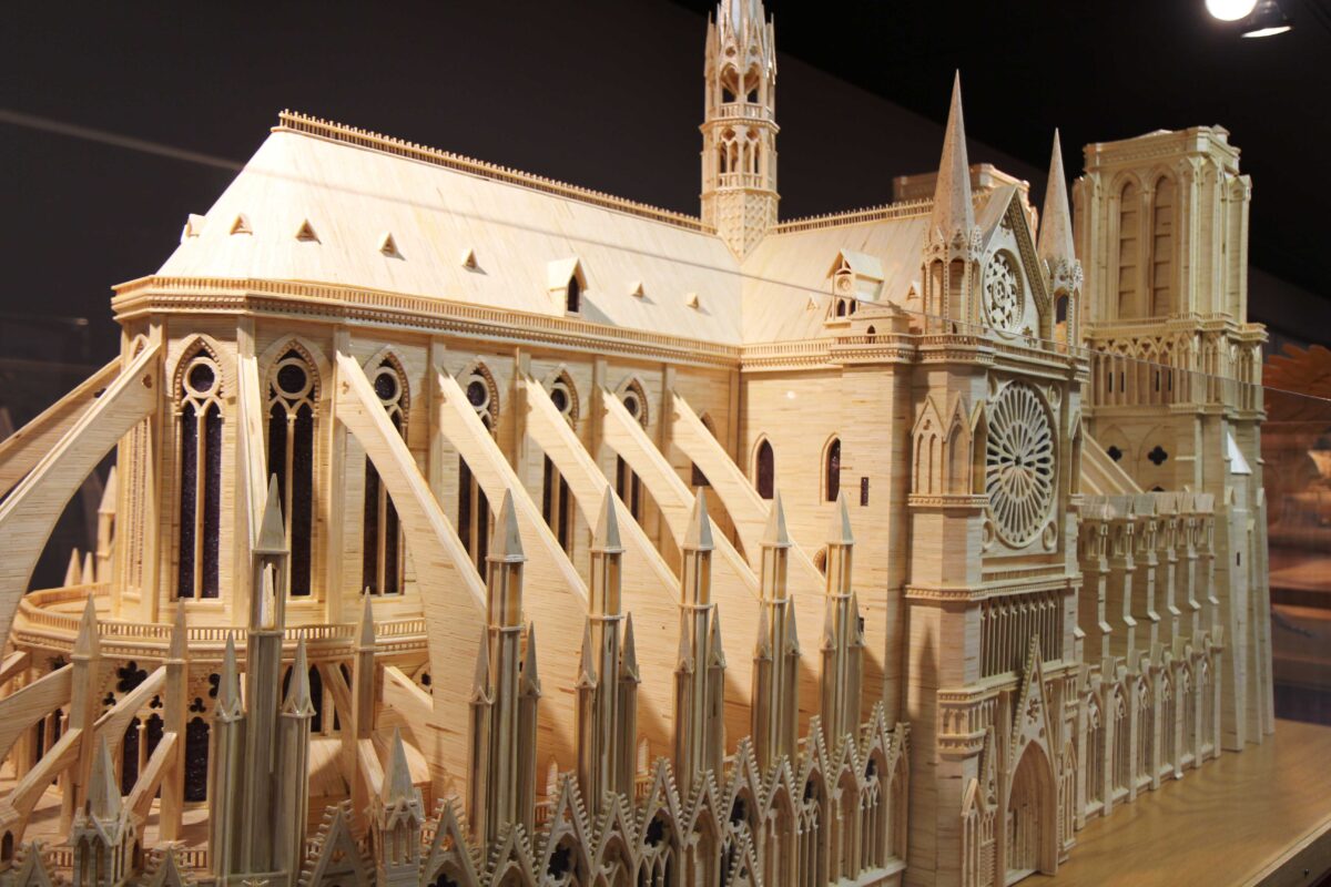 除了宣傳作品、《星球大戰》等令人印象深刻的模型,阿克頓對他的歷史建築特別自豪。也難怪。他不僅用火柴棍建造了雄偉的美國國會大廈直到後面的柱頂、山牆和科林斯柱廊(Corinthian colonnade),而且還做出了巴黎聖母院大教堂的複製品,包括立面、飛扶壁等等,這都是火柴棍的榮耀。