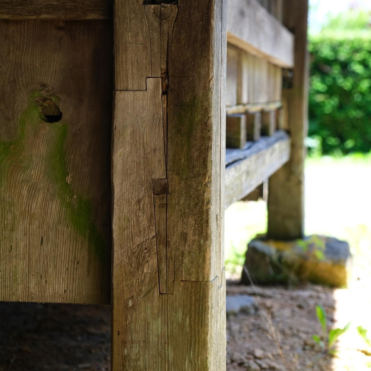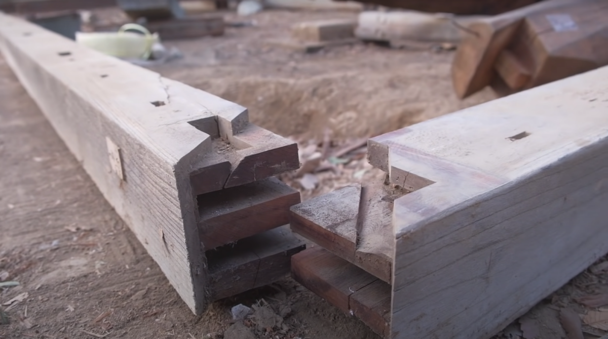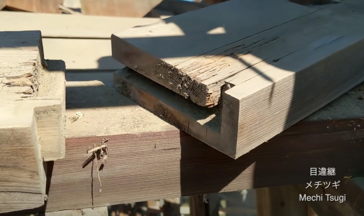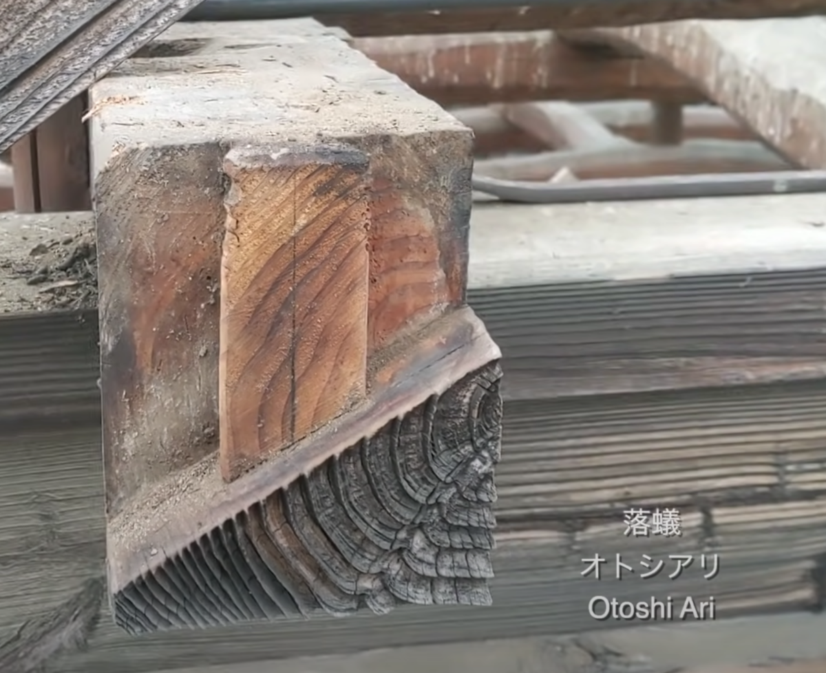 木工團隊發現另一個榫卯位於他們意想不到的地方,因為它不承重,也就是說,在水平直接位於混凝土地基上方的門檻中。這個榫卯結構被稱為「okkake daisen tsugi」,它包括兩塊交叉在一起的部件,一塊重疊在另一塊之上,由兩個鎖定它們的木針固定在一起。這個結構也存在於房梁中,因為它非常堅固。