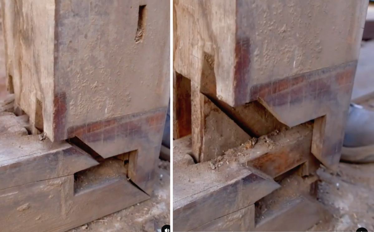 他們遇到的一個挑戰是一個名為「shachi sen tsugi」的榫卯結構,它用插入的楔子將兩個互鎖的部件緊緊地拉在一起,將它們鎖定到位。這種技術用於屋頂周圍椽子上方沿著屋檐邊緣的水平面板。岩之的團隊發現,他們可以通過移除楔塊來拆卸榫卯。