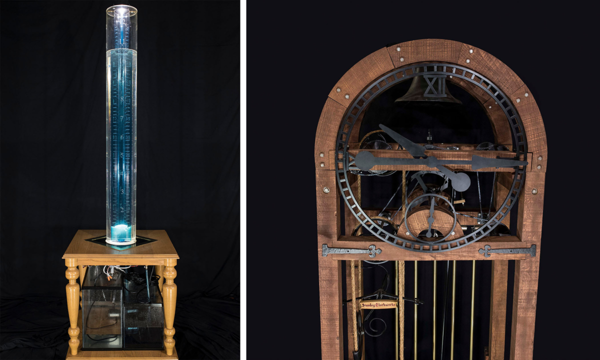 還有更多的時鐘。一個液體時鐘在高大的玻璃燒杯中裝滿報時用的液體。火車時鐘的汽笛聲代替了傳統時鐘的布穀鳥叫聲。多米諾骨牌時鐘每小時翻滾一次以報時,然後自動設置回原位。斯坦利先生的「變壓器鍾」演繹了從老爺鐘變成帶數字計時器的桌子的技術奇蹟。