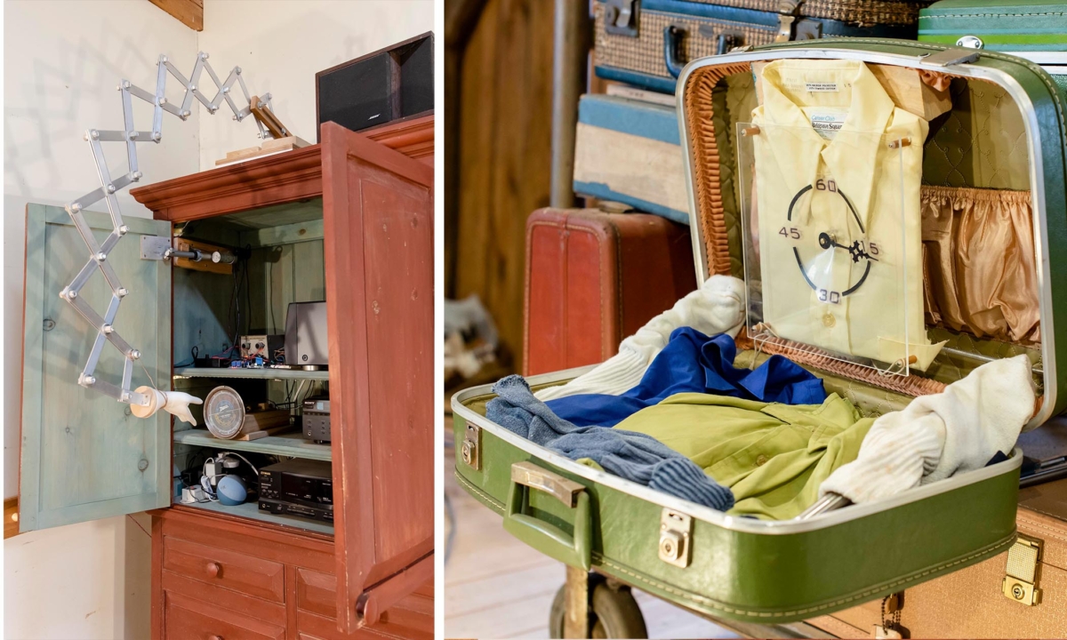 「時間旅行者」是他最新的時鐘之一。推車上有一堆有趣的斑駁行李箱,整體由液壓系統控制。每隔一小時,其中一個箱子就會緩慢地打開,裡面裝滿一堆陳舊雜物和旅行物品。