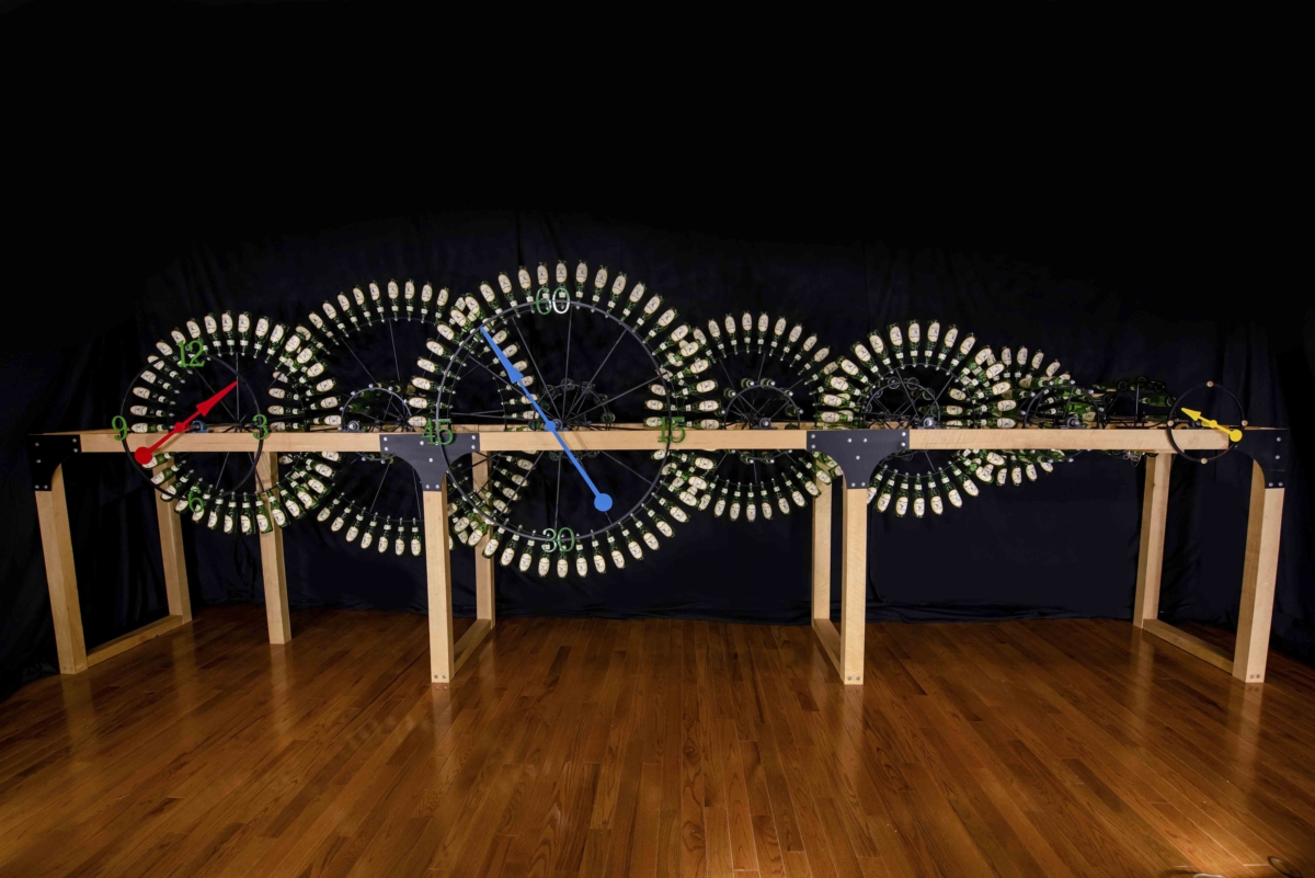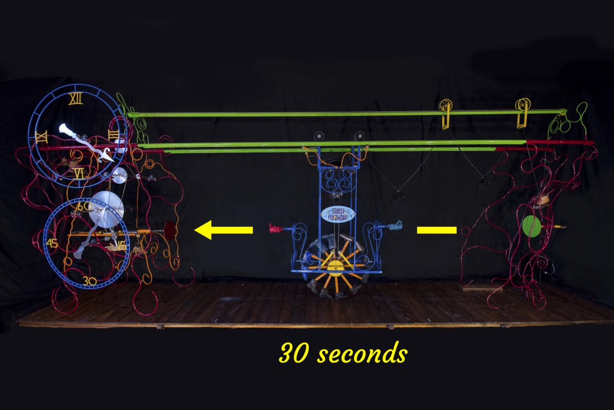 「我感興趣的是用不尋常的物品來精確計時。」斯坦利說,幾十年來,他製造了幾十個奇怪的時鐘裝置,其中一些長達數十英尺。「我用各種不同的日常生活物品來製作時鐘,比如球、高爾夫球、瓶子、自行車。我的願望是,人們看著它時會說,『呵呵,我可從未想過這個東西可以用來計時。』」