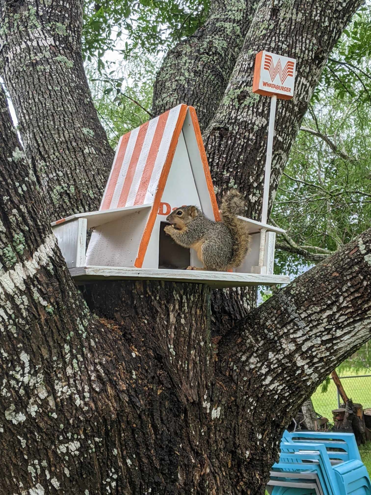 「有一天下雨了……萊利說,『嘿,它在家裡躲雨!』那天看到松鼠使用木屋,她真的很興奮。」摩根說,他在Whataburger粉絲頁面上分享了戴爾的故事,並得到了巨大的回應。