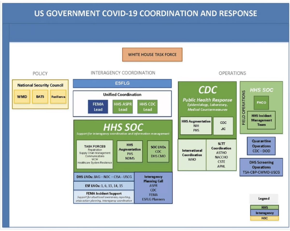在以往的大流行病時期,HHS是所有應對計劃的領導機構,CDC是執行機構。而這次(CODID-19大流行)則大不相同,從2020年3月18日開始,由CDC、國家衛生研究院(NIAID)、美國國力衛生研究院(NIH)及其它公共衛生相關機構組成的HHS,在疫情應對中不再擔任官方領導角色——既不主導政策的制定,也不主導政策的實施,和齊默爾曼在證詞中寫的完全一致。