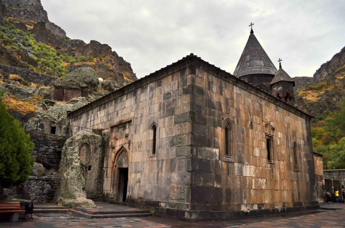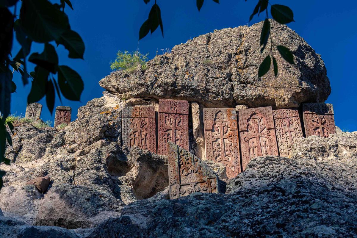 在下降過程中,當遊客轉向山上凝視時,可以看到懸崖上排列著許多帶有十字架的石碑。這些鑲嵌在岩壁內的紀念石碑精心雕刻著先民們的崇拜對象,它們被稱為khachkars。有些是如此複雜,很難想像任何兩個是相同的。Khachkar雕刻長期以來一直是亞美尼亞的傳統,有超過5萬個紀錄。它們在格加爾德隨處可見。