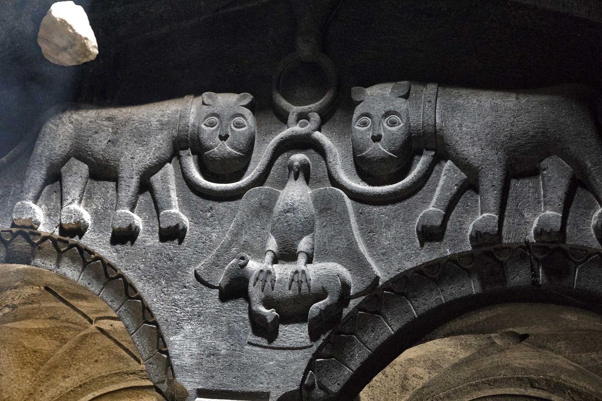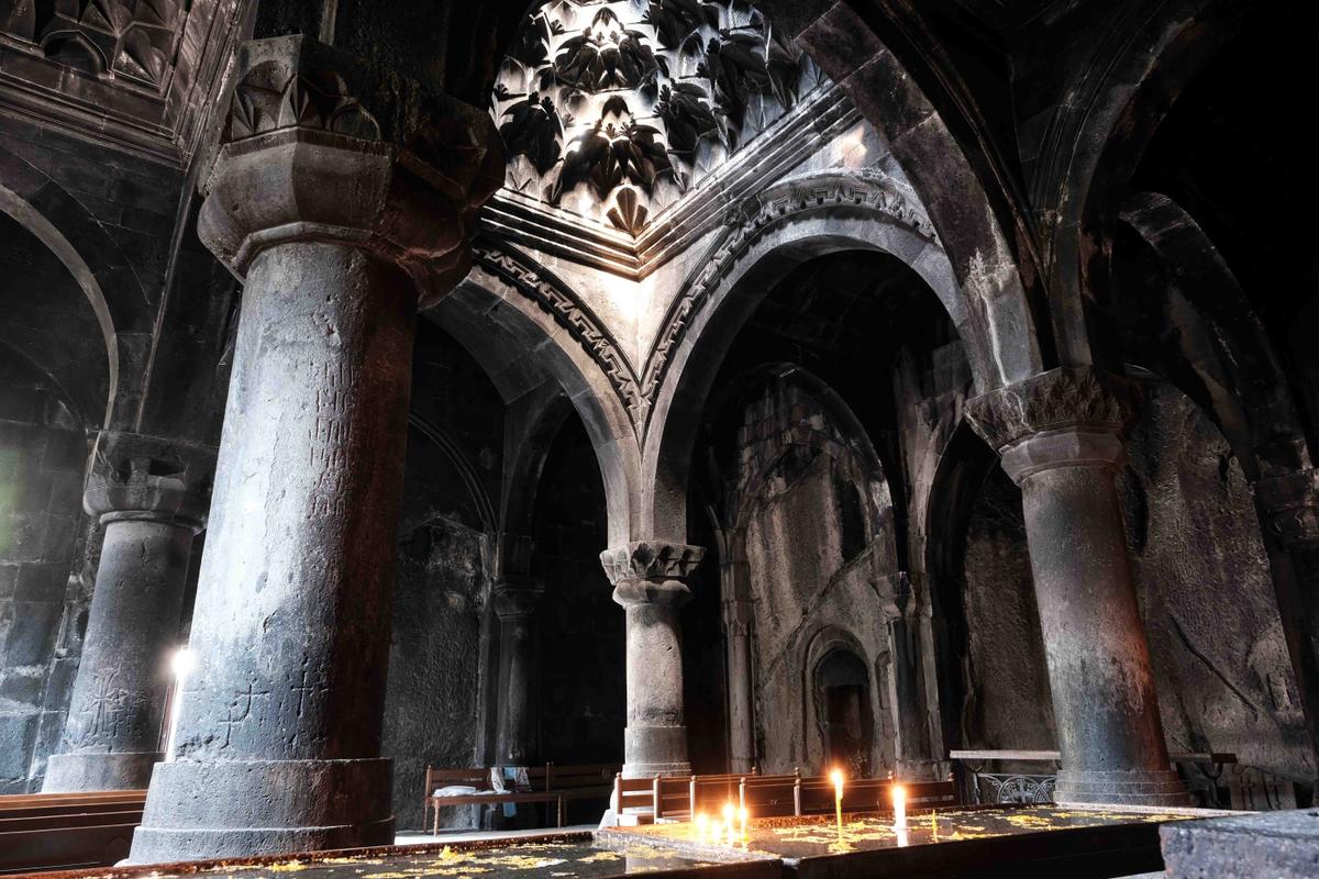 這個奇特的,像是學校體育館的建築叫作「加維特」(gavit),這是一種傳統上建在10世紀和11世紀某些古老教堂西側的聚會場所。這座厚實的石質加維特建於1215年至1225年,它的內部更令人印象深刻:四根巨大的獨立石柱占據了中心。它們支撐著一個帶有中央孔的石頭屋頂,光線可以照射進來。很多朝聖者曾經在這裡停留,也許是在去看刺穿他們救主的長矛的旅程中。今天,當遊客到來時,它內部的蠟燭會被點燃。