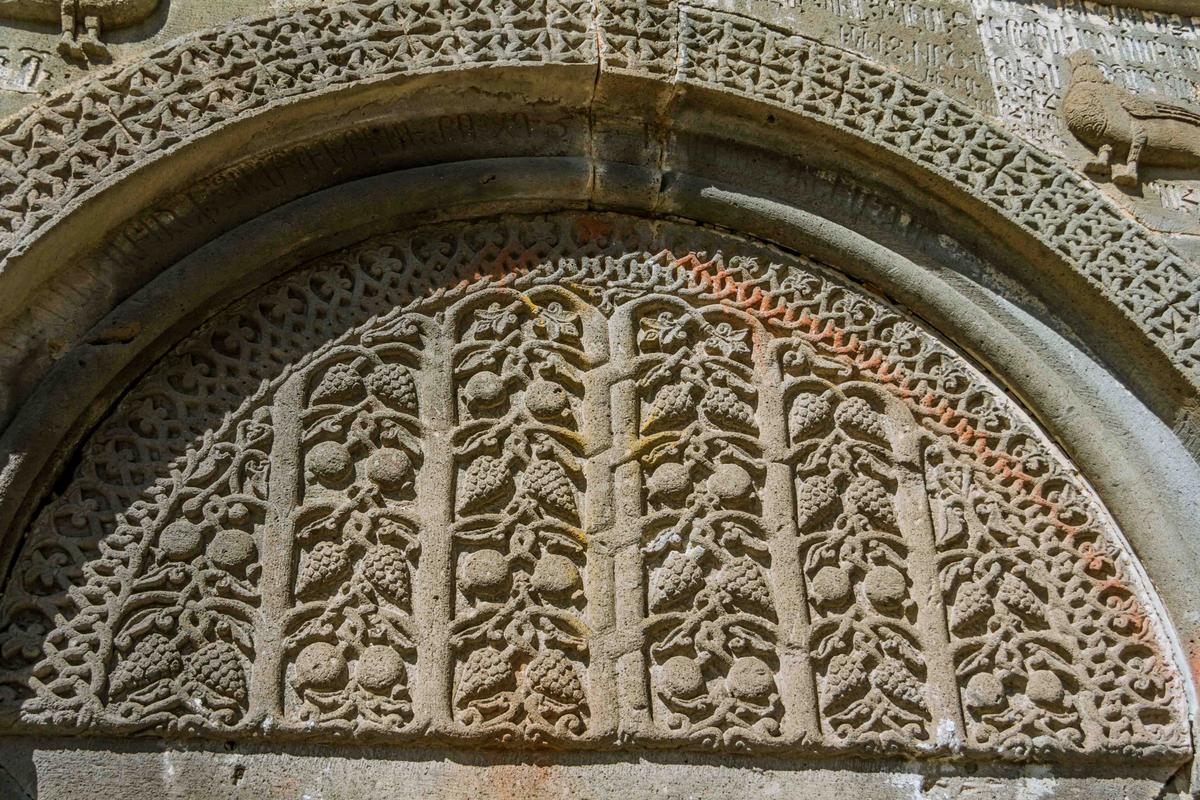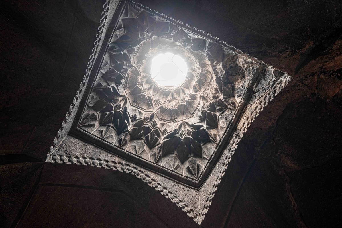 磚石也令人驚歎。從外面進入的西門展示了一個拱形的鼓室,上面裝飾著精美的花雕。中央天花板孔由圓頂加冕,結構鐘乳石垂到四根柱子上。這種帶有天窗的圓頂天花板風格在整個集群中重複出現,並且明顯帶有亞美尼亞特色。
