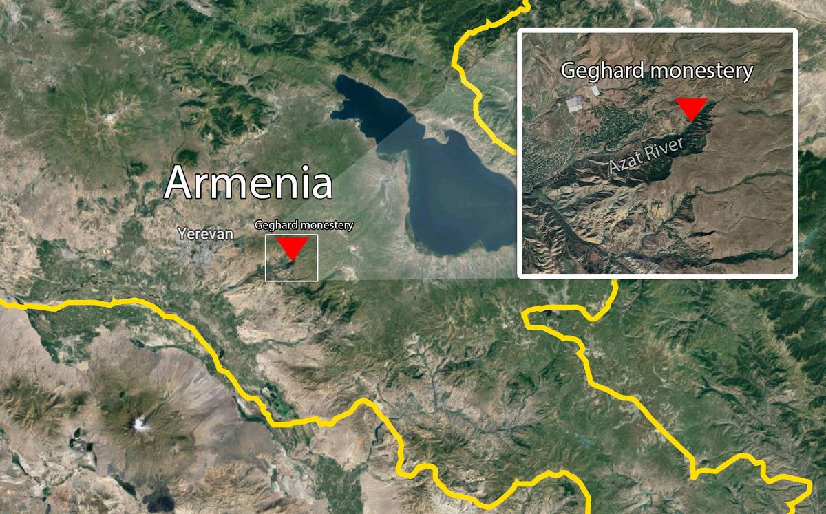 教堂群位於河谷長長的盡頭。今天,這個地方被稱為「格加爾德」(Geghard或Geghardavank),在亞美尼亞語中,意思是「矛修道院」。