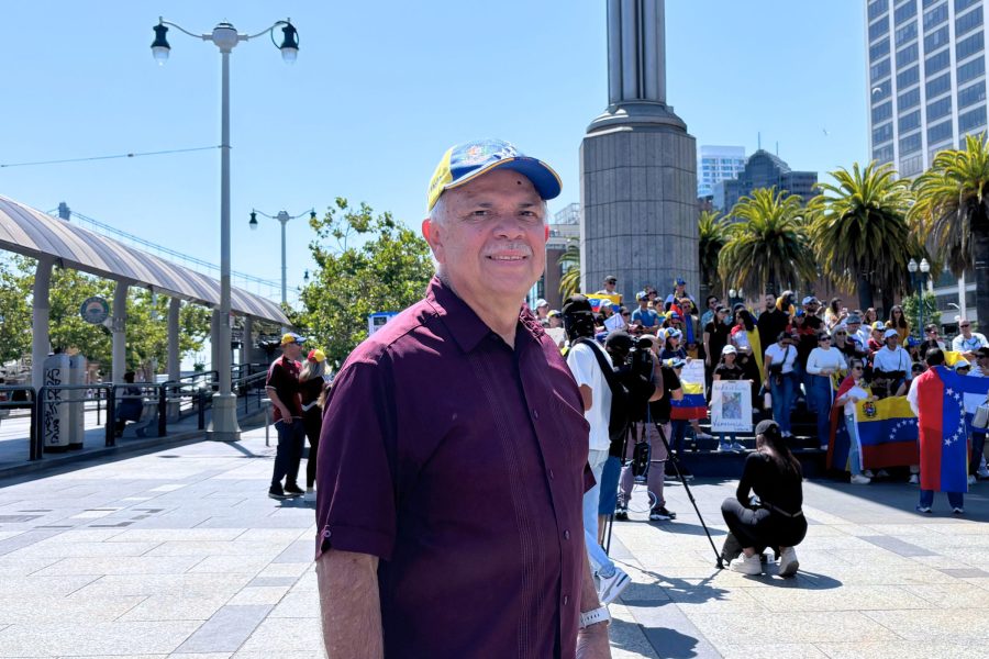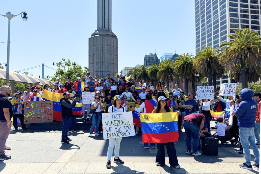 2024年8月3日,灣區委內瑞拉裔在舊金山渡輪大廈前集會,抗議馬杜羅政府偷竊選舉。(路小玉 / 大紀元)