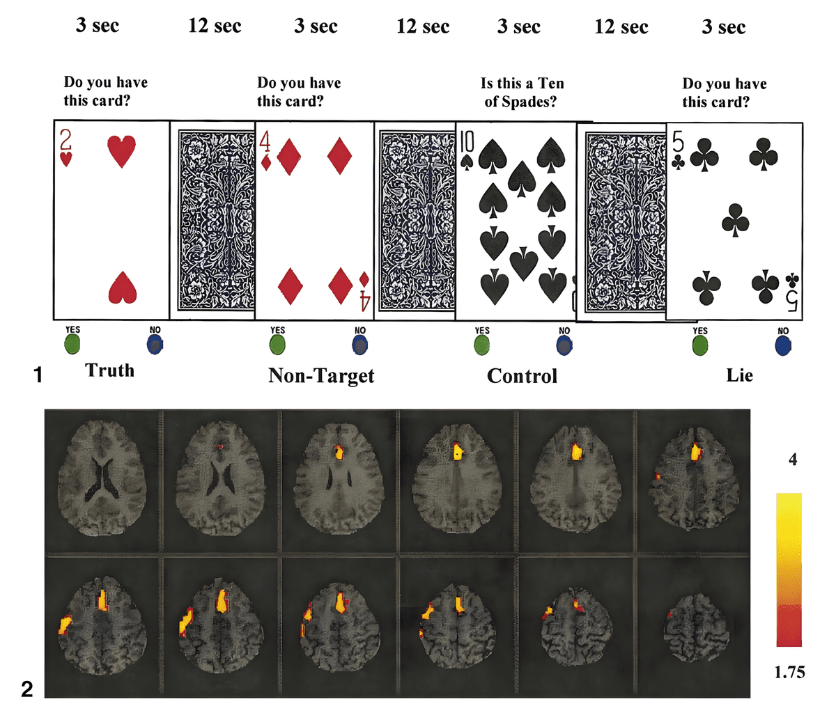 在2002年發表在《神經影像》(NeuroImage)雜誌上的一項具有里程碑意義的研究中,科學家們要求受試者撒謊或說真話,同時測量了他們的大腦活動。研究人員首先向參與者展示一張特定的撲克牌——例如兩張紅桃。後來,當收到另一張卡片時,他們必須回答這張卡片是相同的(說「是」),還是不同的(說「否」)。