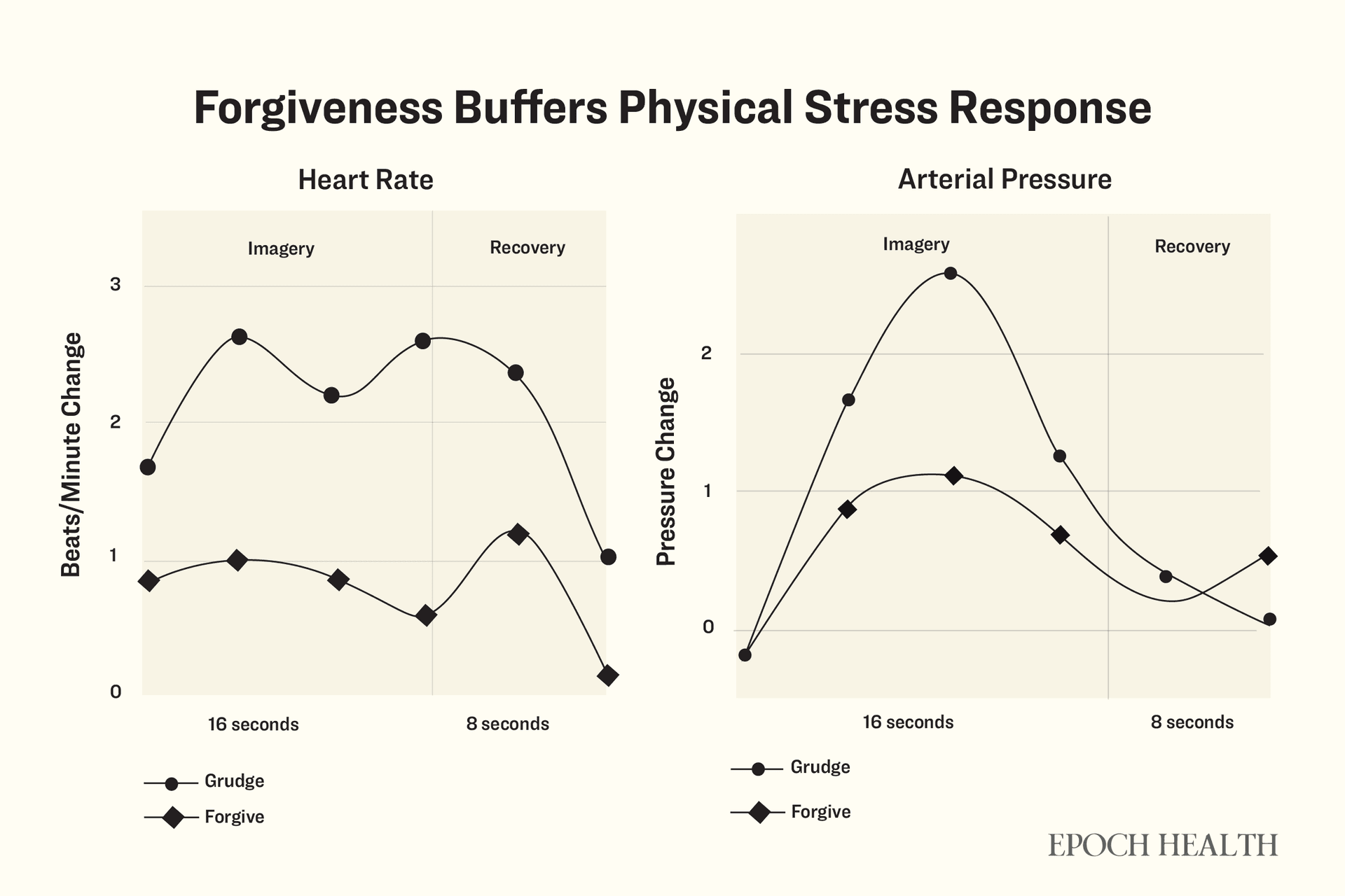 有寬恕想法的參與者沒有強烈的反應。他們的心率、血壓和眉肌緊張度更低,而且更放鬆。寬恕阻止了他們對傷害性經歷做出反應,使他們的壓力反應得到了抑制或「緩衝」。