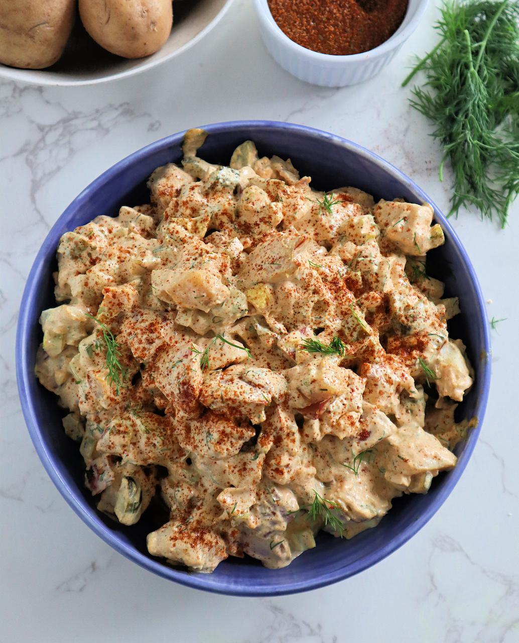 以夏日廣受歡迎的配菜——土豆沙拉(馬鈴薯沙拉),結合辛辣的芥末、清爽酸甜的醃黃瓜汁及醋。還加入了新鮮的蒔蘿(dill)和口感爽脆的芹菜丁。