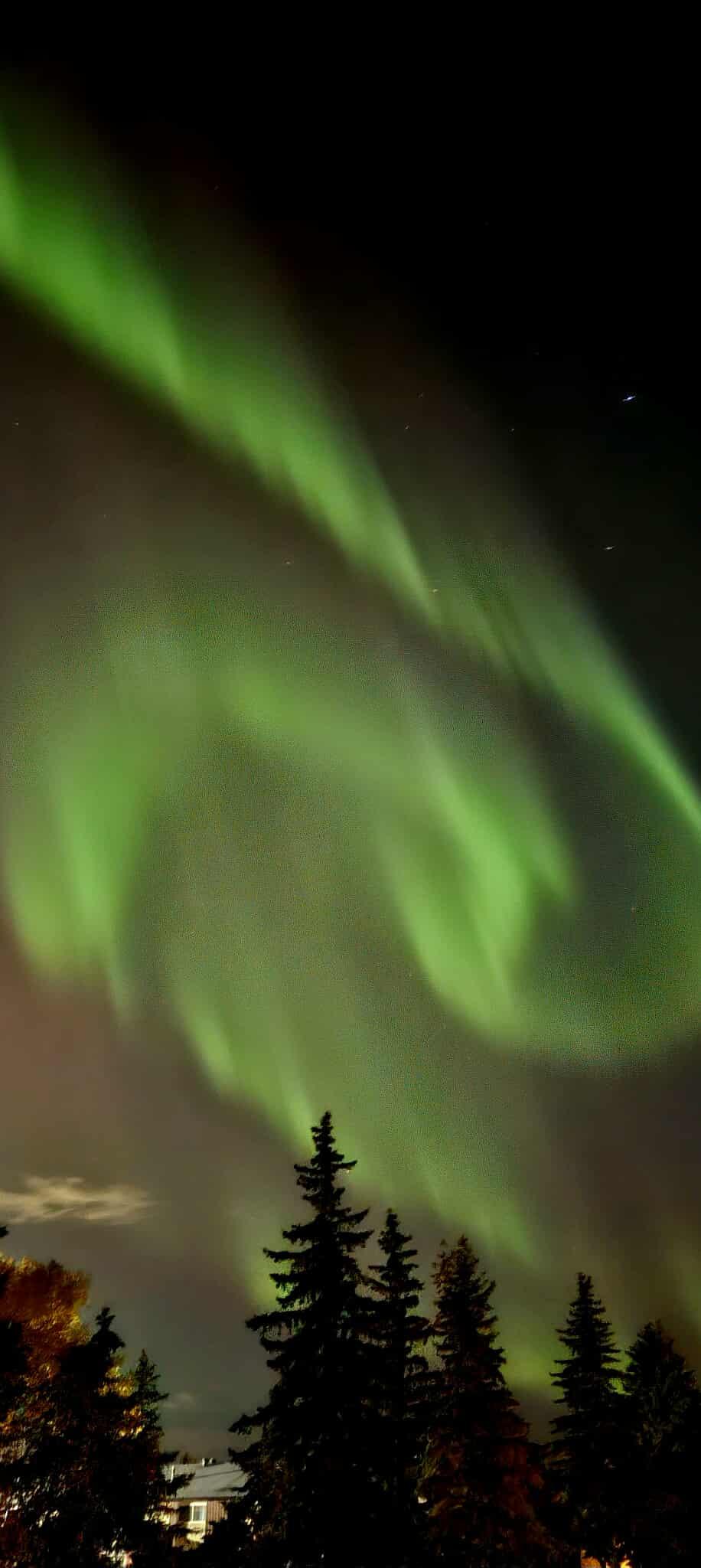 儘管5月初的這個夜晚比平時更為多雲,哈瑟還是用手機拍下了地平線上北極光的最初痕跡。到了午夜,她常常把車停在福特薩斯喀徹溫(Fort Saskatchewan)河邊的船塢處,那是她的家鄉,位於埃德蒙頓東北部,這時北極光已經就在她頭頂上方綻放。