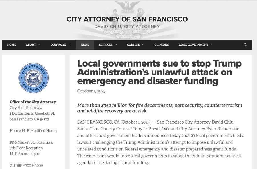 【大紀元記者林子晨綜合報導】10月1日,舊金山、奧克蘭與聖塔克拉拉縣聯合全美逾20個城市與郡縣,在舊金山聯邦法院對川普政府提起訴訟,指控其非法將3.5億美元災害應急資金作為政治籌碼,威脅灣區逾800萬居民及全美3千萬人的公共安全。