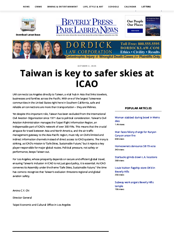 【2025年10月04日訊】第42屆「國際民航組織」(ICAO)大會於9月23日至10月3日在加拿大蒙特利爾舉行之際,駐洛杉磯台北經濟文化辦事處處長紀欽耀 投書美國南加州《比佛利報》(Beverly Press)。該報於10月2日刊登紀處長的專文,呼籲國際社會支持台灣參與ICAO。
