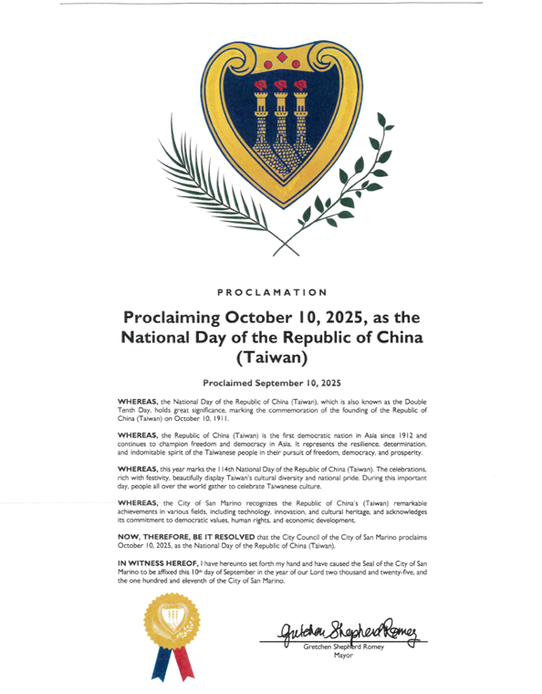 紀欽耀在市政會議中致詞時表示,瑞士洛桑國際管理學院(IMD)於今年6月公布的《世界競爭力年報》將台灣排名全球第六,展現台灣對創新的堅定承諾。台灣目前生產全球90%的高階晶片,為人工智慧及數位經濟的發展注入動力。他強調,台灣期待與美國進一步加強夥伴關係,推動半導體供應鏈及相關高科技產業的合作。聖馬利諾市的宣言,不僅象徵對台灣的支持,更彰顯台美兩國人民之間的深厚友誼與共同價值。