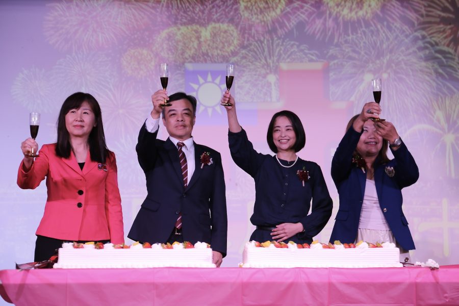伍志翔處長伉儷(左二、右二)、莊雅淑主任(左一)與林秀春主委(右一)偕同現場嘉賓舉杯,共同祝賀中華民國生日快樂。(薛明珠/大紀元)