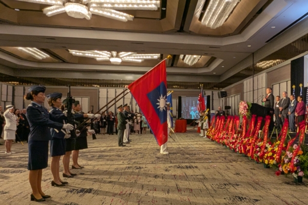 國慶酒會由羅省龍岡親義公所「名義軒」瑞獅團表演揭開序幕,氣氛熱烈。中華聯合旗隊隨後護衛中華民國國旗入場,並由傅爾布萊特獎助計畫得主、音樂家黃冠勻與馬甄翎夫婦領唱國歌,展現台美藝文交流的成果。
