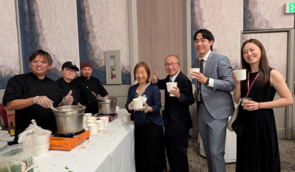為了讓賓客品味家鄉風味,經文處特別準備肉羹麵線、碗粿、滷味等台灣小吃,並搭配華航、長榮與星宇航空提供的國旗蛋糕,以及多家企業贊助的飲品與點心,讓與會嘉賓在美食中感受濃厚的節慶氛圍。