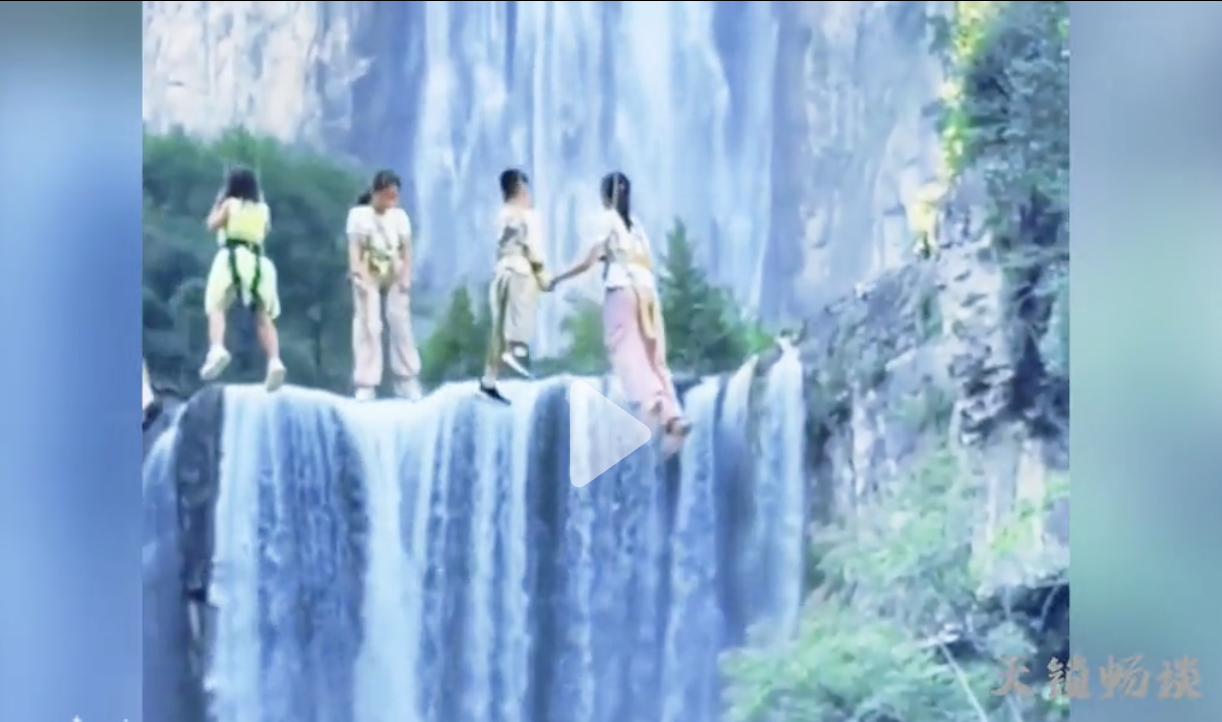 現場視頻顯示,一名女生手持手機站在瀑布前,正在專注拍照時,突然畫面中出現了一排「漂浮」在空中的人影,彷彿從天而降,融入到自然的奇景中。這宛如夢境般的奇幻場景,彷彿穿越了現實與虛擬的界限,引起眾多網民跟貼評論。