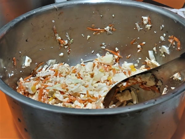2.紅蘿蔔洗淨刨絲,高麗菜洗淨切絲,玉米粒瀝掉水分,這三樣食材和上述的豆腐拌勻。