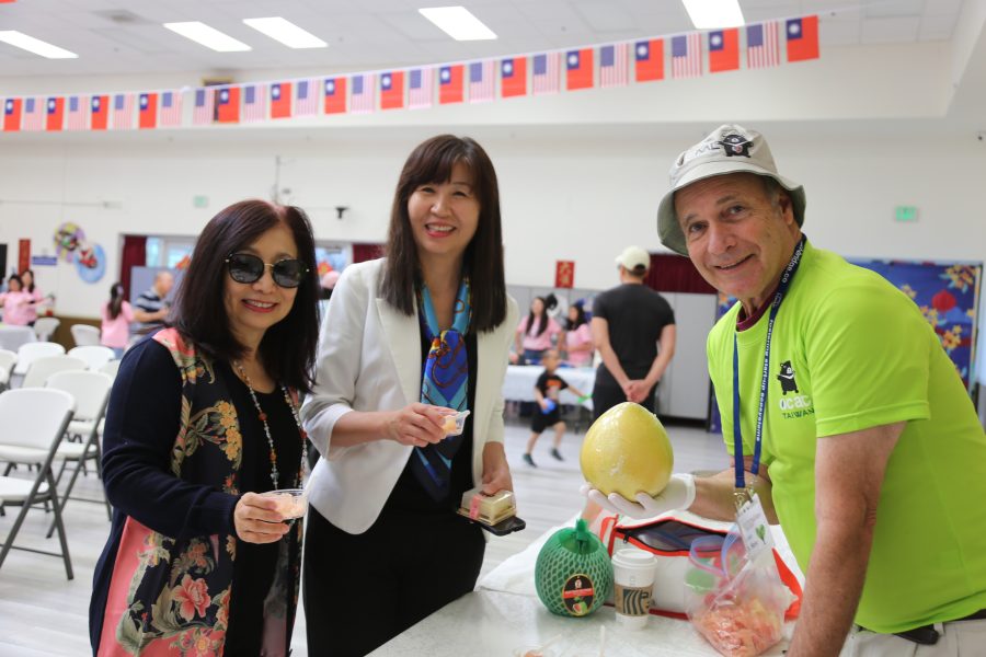 從左至右:董事長賴淑娜、莊雅淑主任和TCML學員,在品嚐柚子。(薛明珠/大紀元)