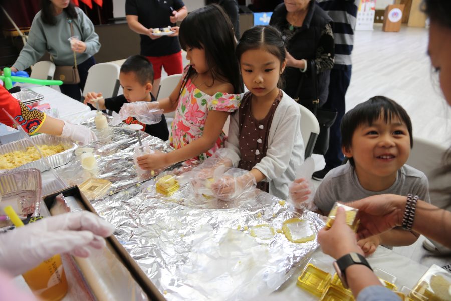 小朋友用綠豆泥做月餅。(薛明珠/大紀元)