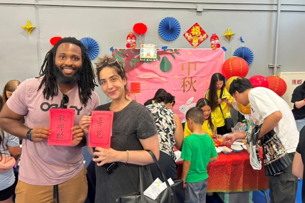 活動攤位設計別出心裁,包括擲筊體驗、紙黏土月餅製作、麻將九宮格遊戲與筷子夾乾麵條挑戰等。文化種子教師顏綠新、顏綠美與朱哲妤現場示範傳統擲筊習俗,並介紹台灣華語文學習中心「愛恩中文學校」,吸引不少家長與孩童參與。