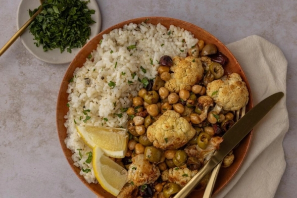 3. 上桌時搭配米飯或意大利麵,撒上橄欖、香菜、薄荷葉,並配上檸檬角。