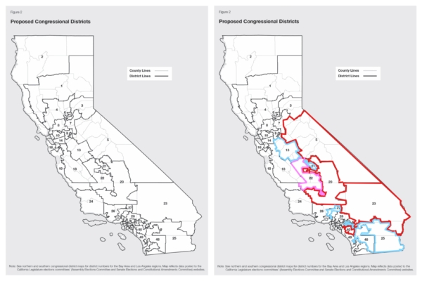州務卿辦公室公布了由州議會新劃分的選區地圖,但地圖為黑白色,難以看出差別。根據2024年選民投票的情況標上顏色的示意圖(非準確選區邊界)則比較清晰。新選區可能使民主黨在52個國會議會席位中上升到48個,圖中白色空白區爲民主黨占優勢的選區,紅色爲共和黨占優勢選區,粉色和淺藍區為偏共和黨或偏民主黨選區。