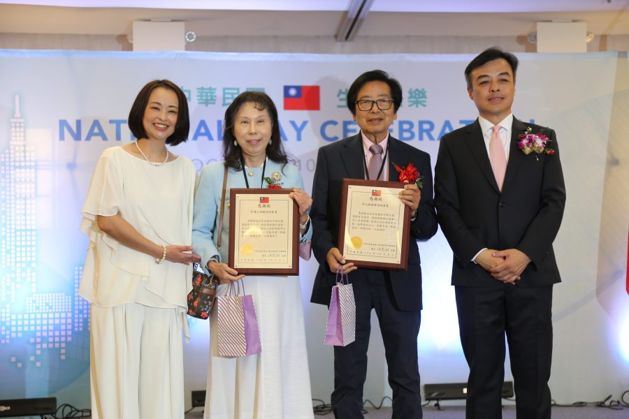 伍處長伉儷頒發感謝狀給卸任僑務委員李漢文、李文雄。(薛明珠/大紀元)