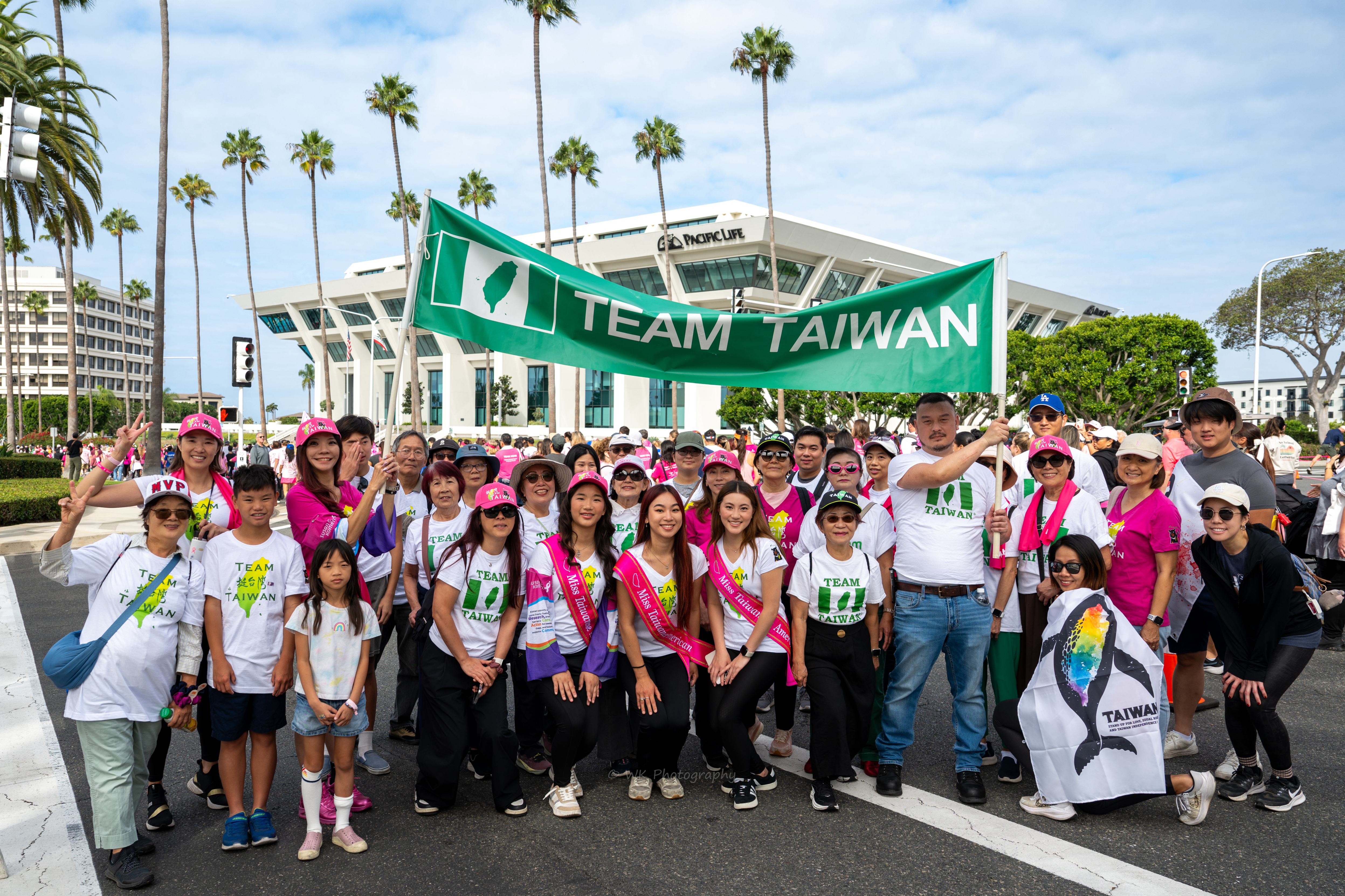 現場還有2025年台美小姐王后王怡文、第五公主楊千樂、第六公主陳彥竹前來助陣,與TAP-OC的青年志工們一同展現台美社團的團結與熱情。「Team Taiwan」的旗幟在粉紅人海中格外醒目,吸引不少參加者駐足合影,讓更多主流社會人士認識台灣社區的活力與善意。
