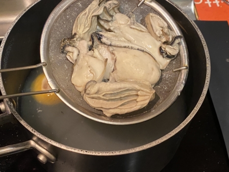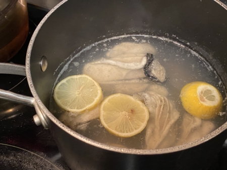 1. 生蠔洗淨後,放入一鍋熱水中,加入檸檬片及薑汁。