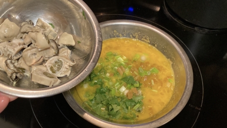 3. 雞蛋打散加調味料拌勻,放入芫荽、蔥、菜脯、薑蓉,生蠔切小塊加入蛋液內。