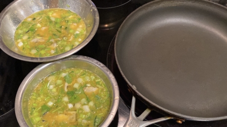 5. 鍋中下油,放入蛋液混合物煎香至金黃便可。