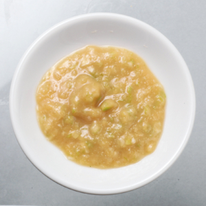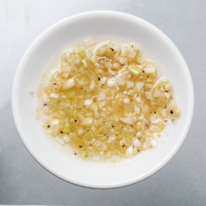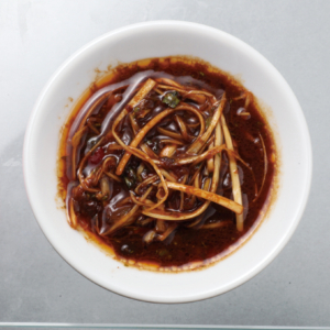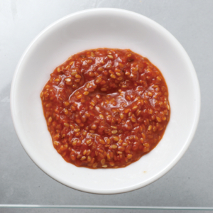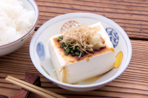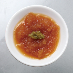 將蘿蔔泥和醬油放進碗裡拌勻,淋在瀝乾水分的豆腐上,附上柚香胡椒醬裝飾即可。