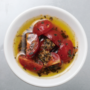 小番茄洗淨去蒂、縱切成4等分,將所有材料放進碗裡拌勻,把瀝乾水分的豆腐盛盤,淋上醬料即可。