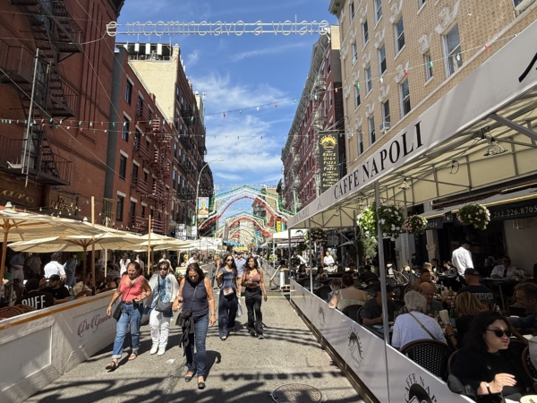 離曼哈頓華埠一街之遙,走進茂比利街(Mulberry Street),眼前忽然一亮:紅、白、綠三色燈串在街道上方交織成彩虹拱門,空氣裡瀰漫著油炸麵糰的甜香、炭火烤香腸的辛辣氣息、披薩的焦香與濃郁的番茄味。美食攤位前人潮洶湧,這就是熱情洋溢的第99屆小意大利聖真納羅節(The Feast of San Gennaro),將「小意大利」社區的活力喚醒。若要真正理解「小意大利」,不只是用眼睛看建築,而是要用耳朵聽故事,用味蕾去感受文化。