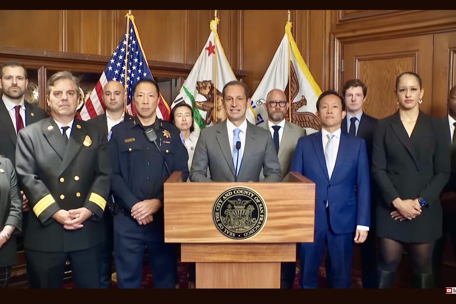 2025年10月22日,舊金山市長羅偉與眾政府官員,在市政廳直播聲明。(薛明珠/視頻截圖)