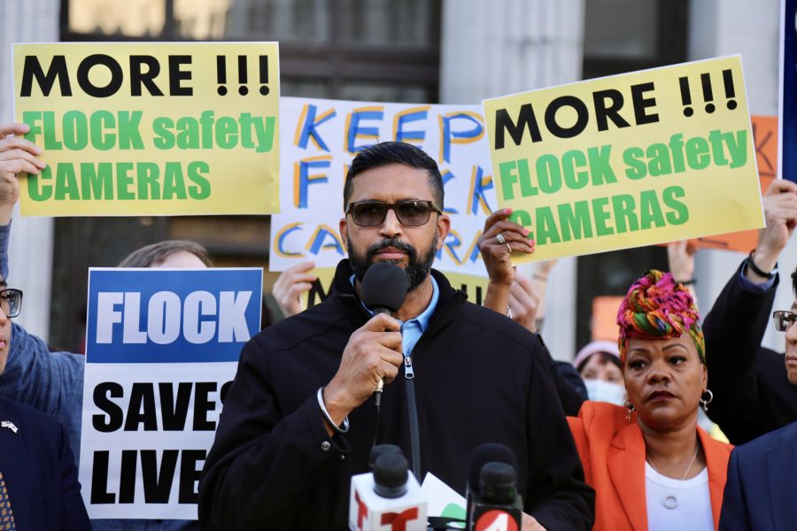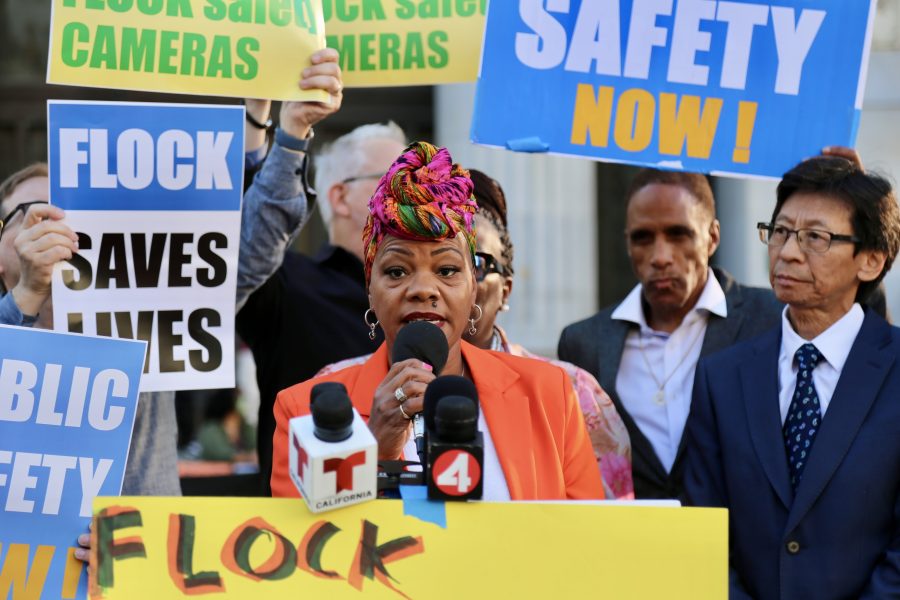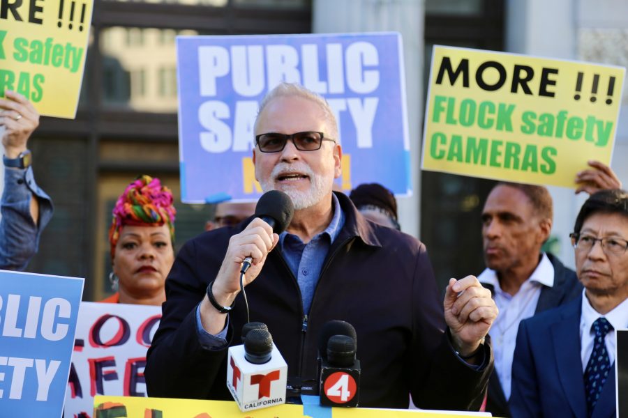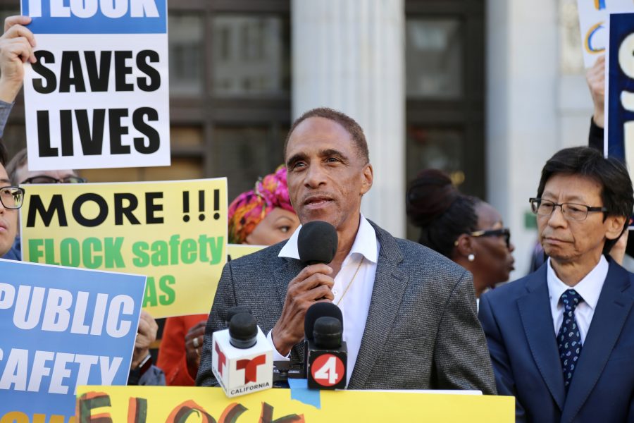 活動主辦人Edward Escobar在集會開場中高喊:「公共安全、公共安全、公共安全!」他強調,奧克蘭正面臨失控的犯罪浪潮,每年超過一萬輛汽車被竊,嚴重影響居民與商家安全。Escobar 表示:「奧克蘭警局人力不足,Flock 攝影機能幫助警方鎖定嫌犯車牌、破案、降低犯罪。自 2024 年部署以來,汽車盜竊率已明顯下降。」