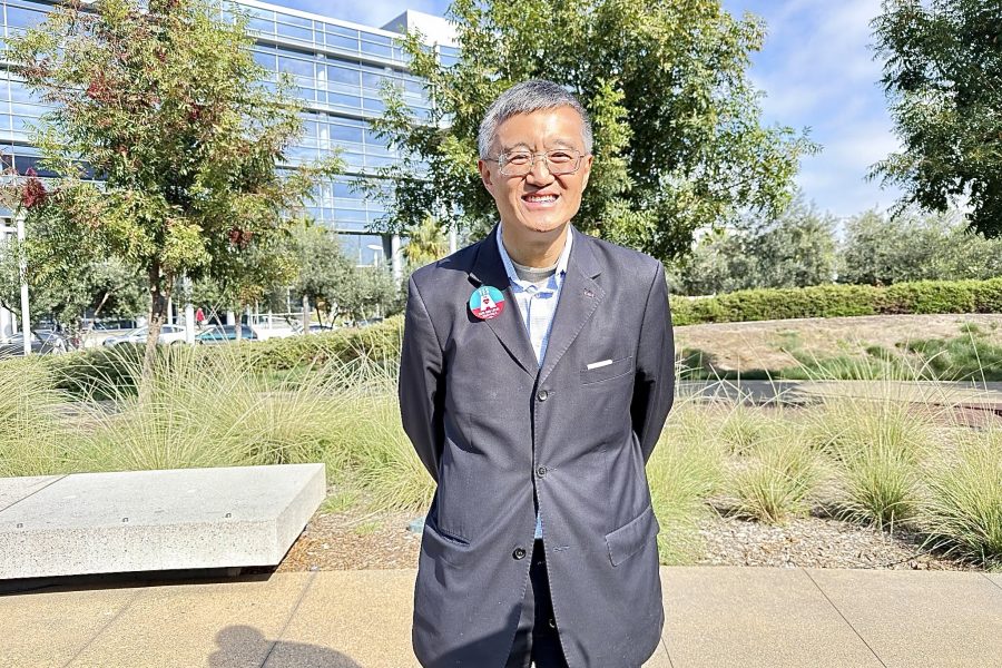 2025年9月22日,Cupertino市長趙良方,在聖塔克拉拉縣政府廣場呼籲投票否決Measure A。(薛明珠/大紀元)