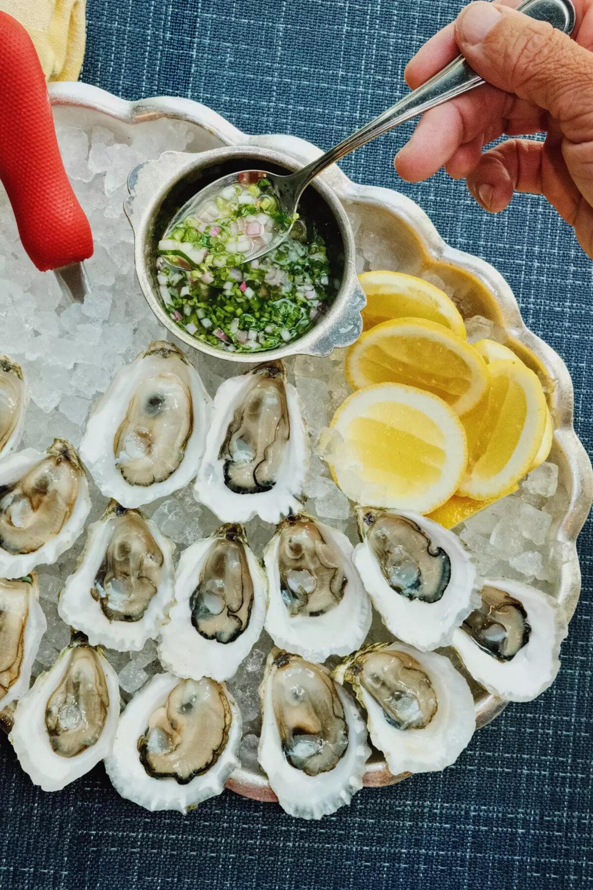 將撬開的生蠔平鋪於冰上呈盤。科倫德喜歡選用鵝卵石冰,因其「質地輕盈」,且能將生蠔穩穩嵌入冰中保持水平,避免傾斜導致牡蠣汁液溢出。他特別指出,像Chick-Fil-A和Sonic這類快餐店會出售鵝卵石冰。其實任何冰塊皆可替代。牡蠣保鮮的黃金法則是保持低溫。
