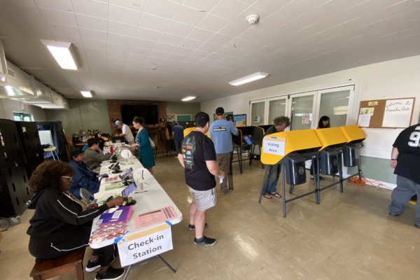 一位女士帶著女兒同來,是等孩子運動隊訓練結束、接了孩子才過來的,「我可能是等到最後時刻才做事的人吧」。另一位年輕女士說,家裡老人不慎把選票弄髒了,所以不能用郵寄選票了,只能到投票中心來。