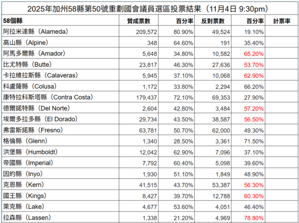 根據州務卿辦公室,加州的58個縣必須在12月5日前報告結果;州務卿將在12月12日前認證選舉結果。截至週二晚8點59分,州務卿網站已計算了44.8%的選票,初步選舉結果為:64.7%的選民投下支持票,35.3%的選民反對,全州當前開出約700萬張選票。