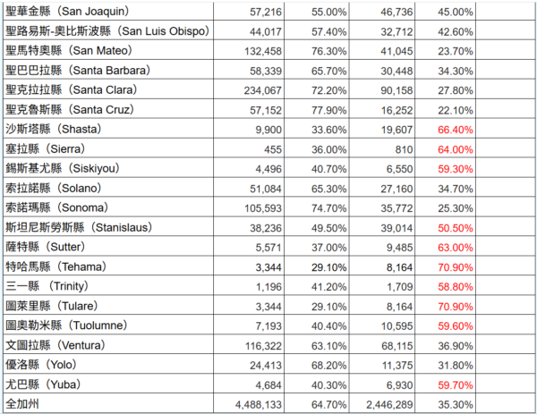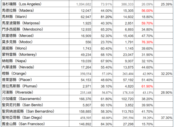 此外,聖地亞哥縣的註冊選民超過198萬,橙縣超過186萬,河濱縣超過137萬,聖貝納迪諾縣超過119萬,聖克拉拉縣(Santa Clara)超過104萬,這6個縣的註冊選民合計超過了加州註冊選民的一半。◇