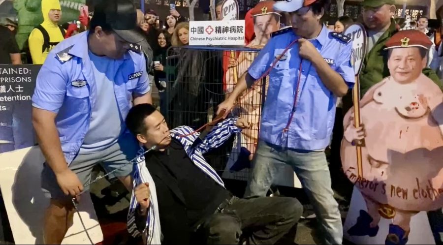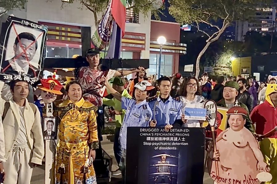 Santa Monica Boulevard 當晚人潮洶湧。遊行隊伍中,有人化身皇帝與維尼熊,諷刺習近平的權力獨裁;有人扮演中國警察、醫生與囚犯,重現抓捕異議人士、鎮壓信仰者與活摘器官的場景;還有以牢籠、十字架象徵被迫害者的痛苦命運。