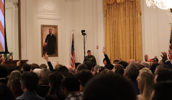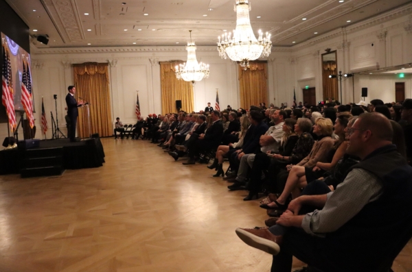 尼克松圖書館在當天加強了安保,四名橙縣警察站在會場監看。諾爾斯談到了尼克松總統,隨著圖書館在2016年翻修後煥然一新,公眾開始以新的角度看待總統遺澤。