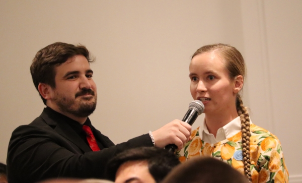 「辯論主持人、我和對話方在走向舞台前聽到了爆炸聲,安保人員迅速護送我們返回後台。」諾爾斯陳述,辯論開始後,示威者在禮堂內擾亂秩序,一位戴著帽子、墨鏡和口罩的抗議者氣勢洶洶的走向舞台,被保安阻止。學校隨後發布緊急通知,辯論會提前結束。